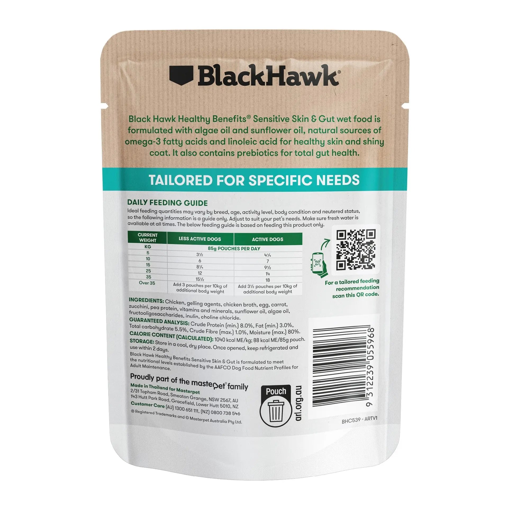 Support your dog’s skin health and digestive comfort with Black Hawk Healthy Benefits Sensitive Skin & Gut Chicken & Vegetables Wet Dog Food 85g. Specially developed with veterinarians and animal nutritionists, this gentle recipe features highly digestible chicken, eggs, prebiotics, and beneficial oils to help maintain a healthy gut, strong muscles, and a nourished skin and coat. Served in a rich, tasty broth with a soft texture, it’s ideal as a complete meal or topper for adult dogs with sensitive systems.