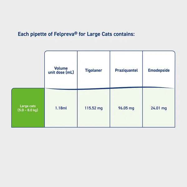 Felpreva® Spot-On Solution for Cats delivers cutting-edge, all-round parasite protection in a single, easy topical dose. Specially formulated for large cats weighing 5 kg to 8 kg, Felpreva® provides up to 13 weeks of continuous protection against fleas, paralysis ticks (Ixodes holocyclus), ear mites and a wide range of internal parasites including roundworm, lungworm, hookworm and tapeworm.