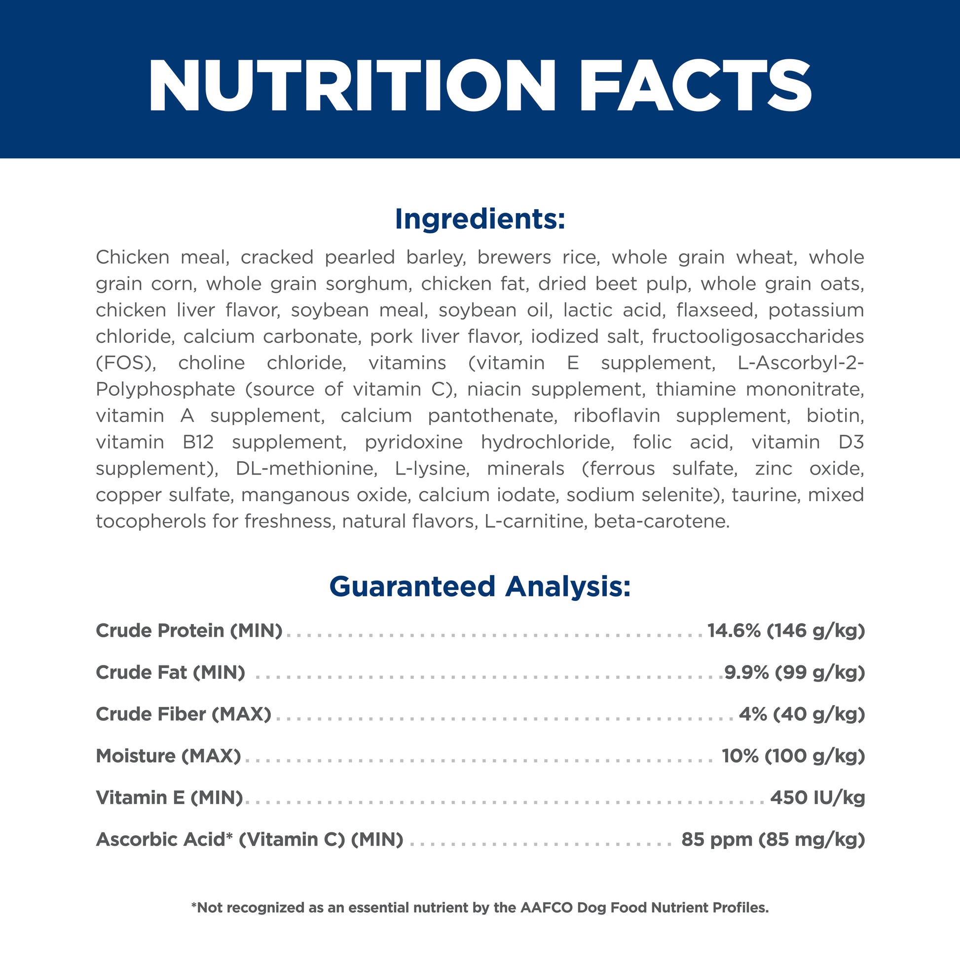 Support your small or toy breed dog through their golden years with Hill’s Science Diet Adult 7+ Small Bites Dry Dog Food. Specifically crafted for dogs aged 7 and older, this formula features easy-to-digest ingredients in a delicious chicken, barley and rice recipe, with smaller kibble perfect for dogs who prefer variety.