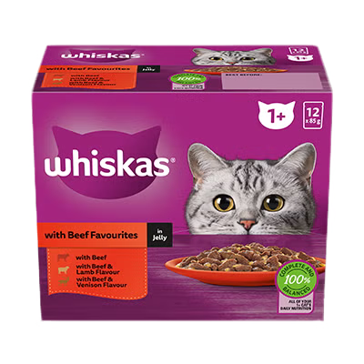 WHISKAS® Wet Cat Food Beef in Jelly is a delicious, 100% complete and balanced meal that supports cats at every life stage. Made with high-quality beef, each pouch is carefully prepared to lock in natural goodness and taste, providing the essential nutrition your cat needs for a healthy and happy life.